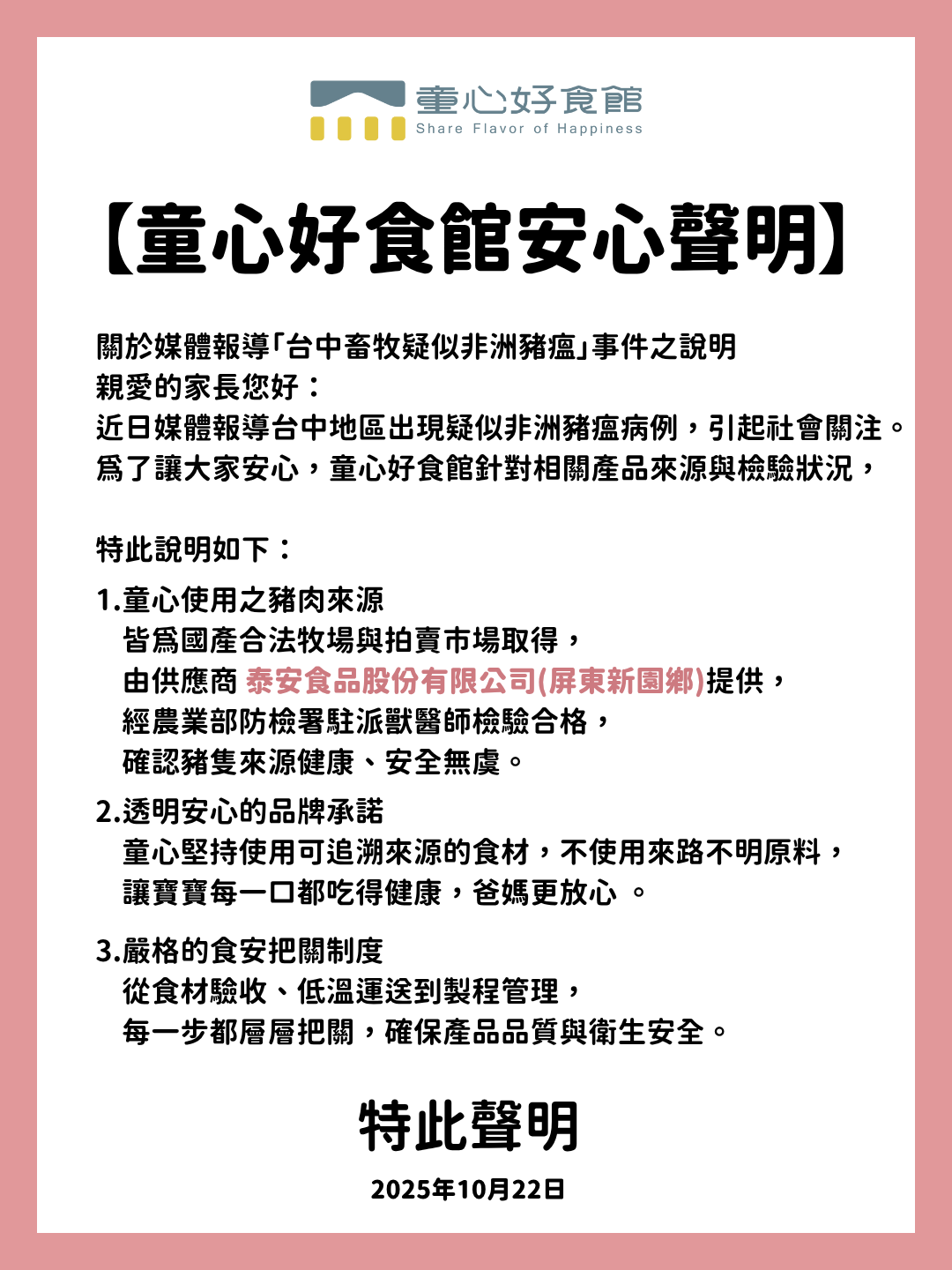 【童心好食館|國產豬安心保證|每一口都經過檢驗把關】 每一口進到孩子嘴裡的食物, 我們都希望是透明、單純,也能讓爸媽放心微笑。 童心所使用的豬肉,皆由泰安食品股份有限公司(屏東新園鄉) 提供, 經農業部防檢署駐派獸醫師檢驗合格,確保豬隻來源健康、安全、無虞。 從食材驗收、全程冷鏈處理、低溫運送,確保肉品的安全我們一步步都依循 HACCP 食品安全制度 嚴格把關,讓寶寶吃得開心,也讓爸媽更安心。 童心會持續守護每一個家庭的餐桌,用最純粹的食材,陪伴孩子每一次成長的好胃口