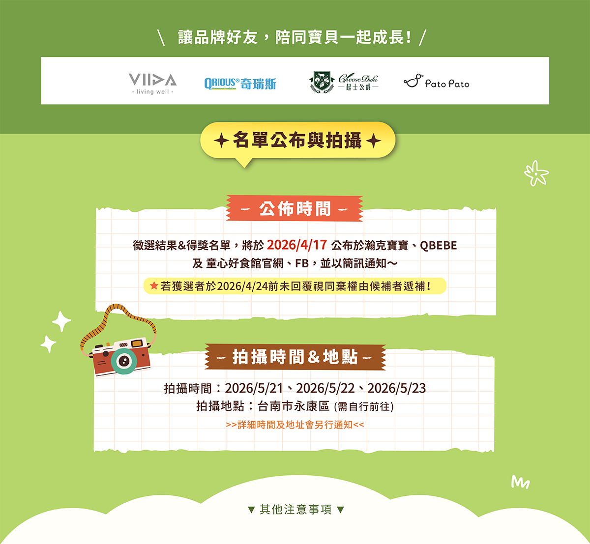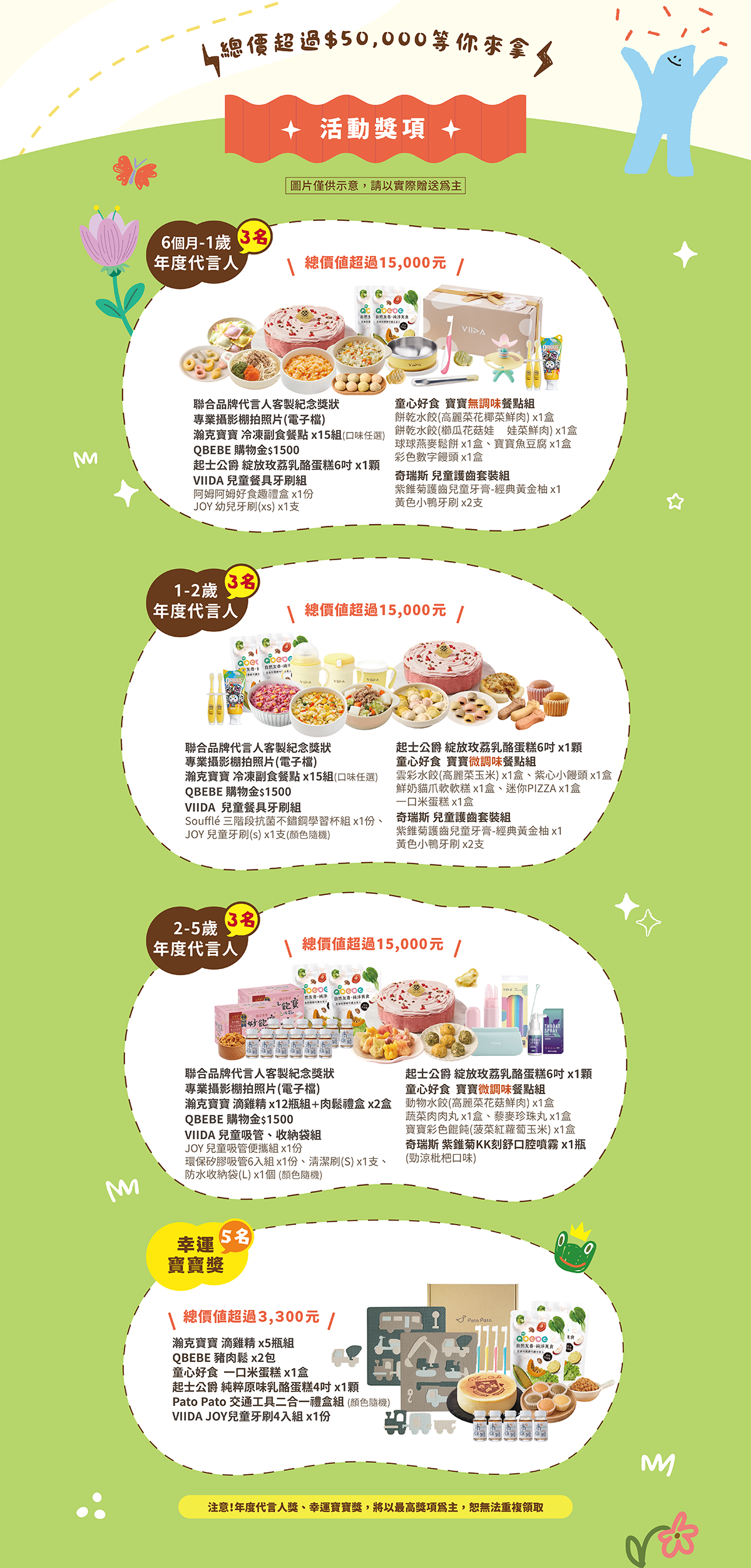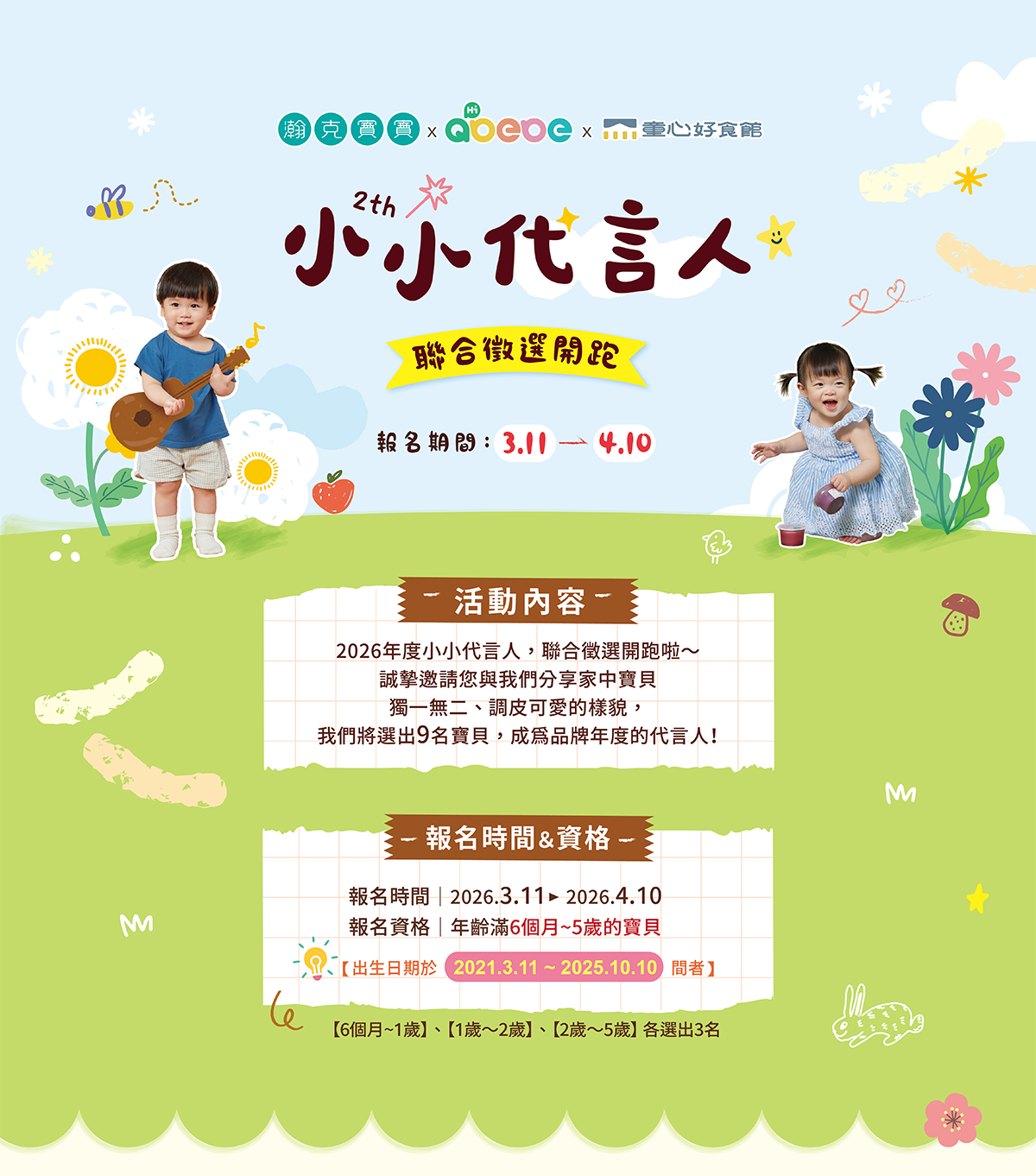 3. 參加年齡限出生於 2021年03月11日~ 2025年10月10日間者,獲選之寶貝須提供健保卡確認年齡,不符將取消資格,由候補者遞補。