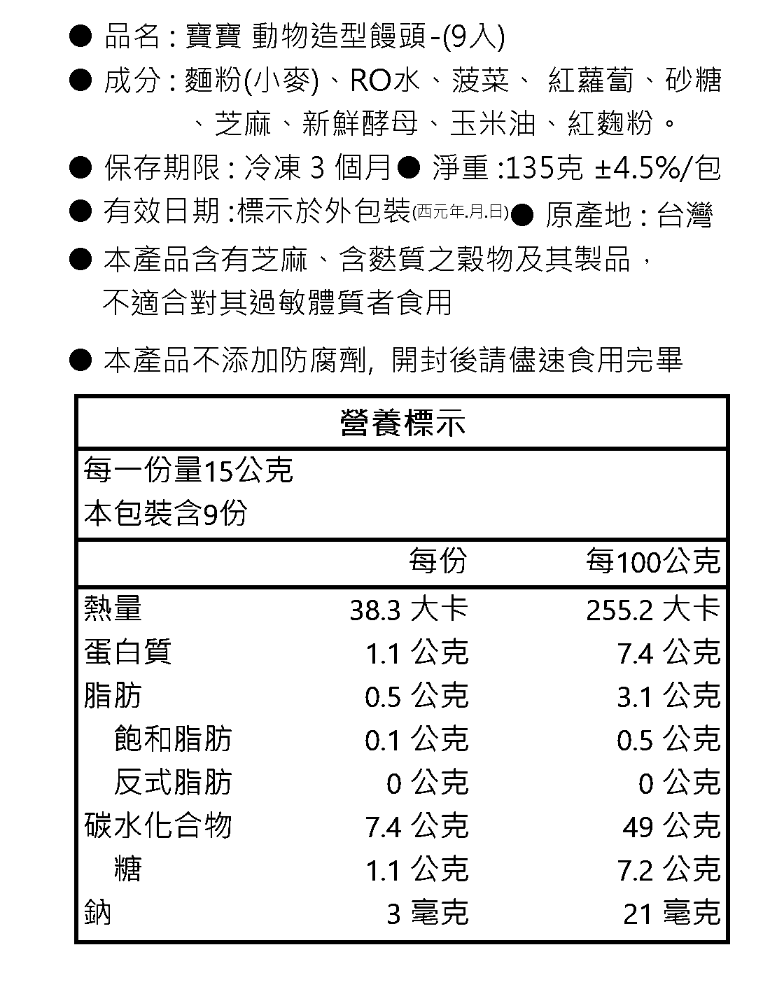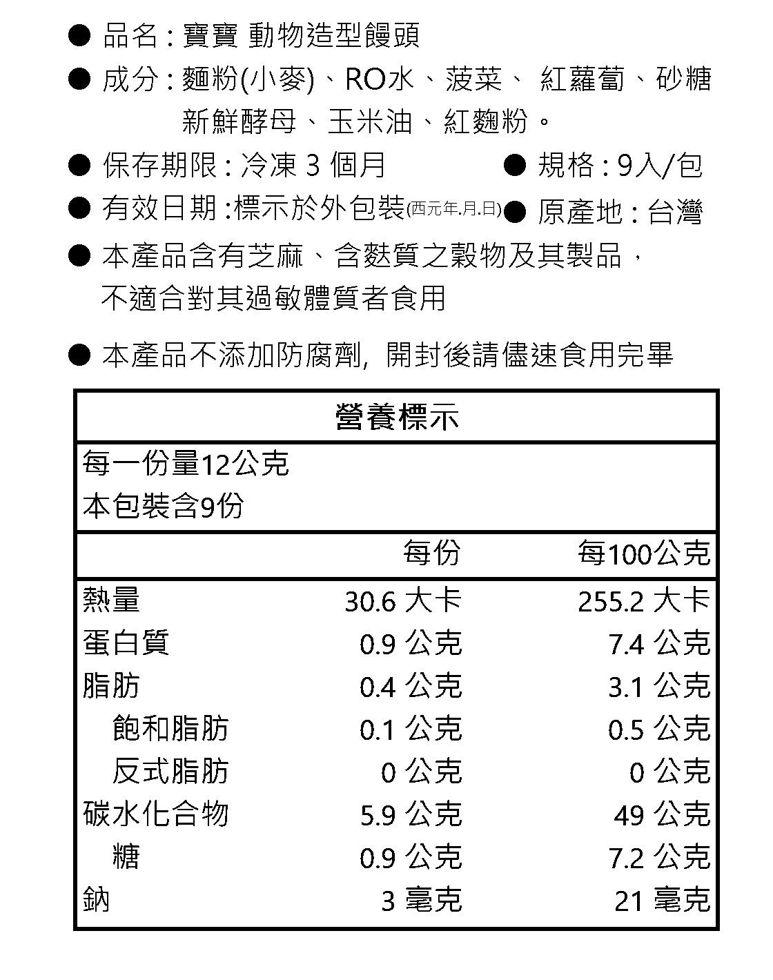 註: 寶寶饅頭是手工製作的,每批饅頭會有些微的大小差異,以每一包裝內9入為主。依動物造型不同,重量約在10-18克之間。