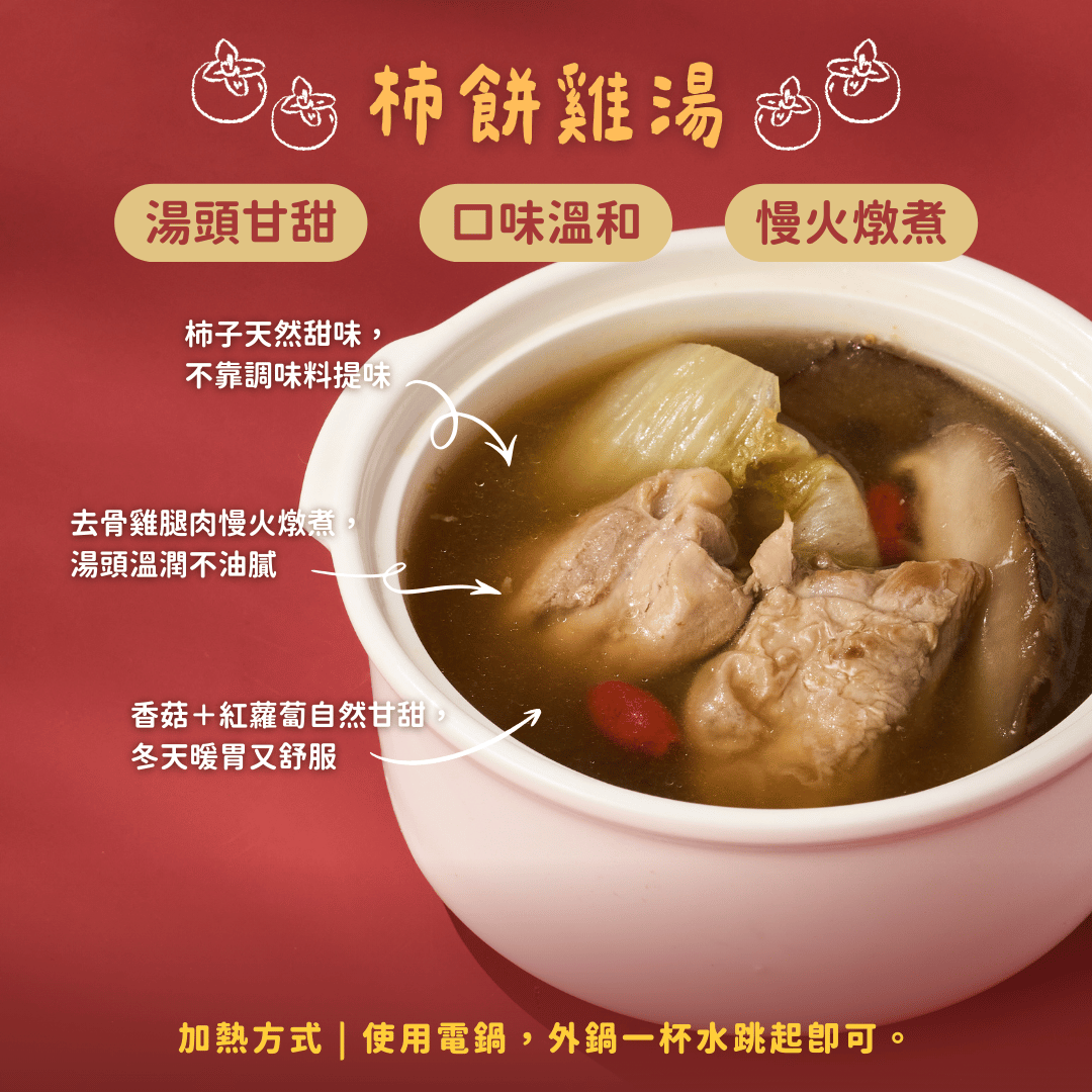 商品詳情 有購買此品項的訂單,整張訂單將會01/14 開始陸續出貨。 如果有較急需其他產品的訂單,請另外下單喔,謝謝您。 2026年菜單品-柿餅雞湯|微調味|1Y+ (1/14陸續出貨) TWD $299 TWD $299